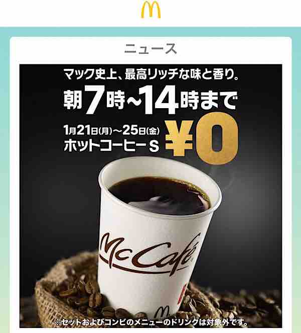 日付と時間限定のキャンペーンではありますが,マクドナルドのコーヒーをお得に楽しめますので,お勧めです。